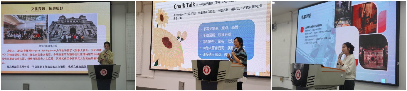 项目成员从多维度分享了所学习的教学理论与策略。思政专业宋奕洁系统介绍了项目实施、课程设置与实践成果,坦言研学实现了教育理念更新与视野拓展;龙星宇拆解了Chalk Talk、三个“为什么”等创新教学法,为课堂从“知识本位”转向“能力本位”提供实操路径;美术专业张晶晶结合在加研学见闻,分享了如何挖掘自然与城市场景中的教学资源,让知识与生活深度联结。